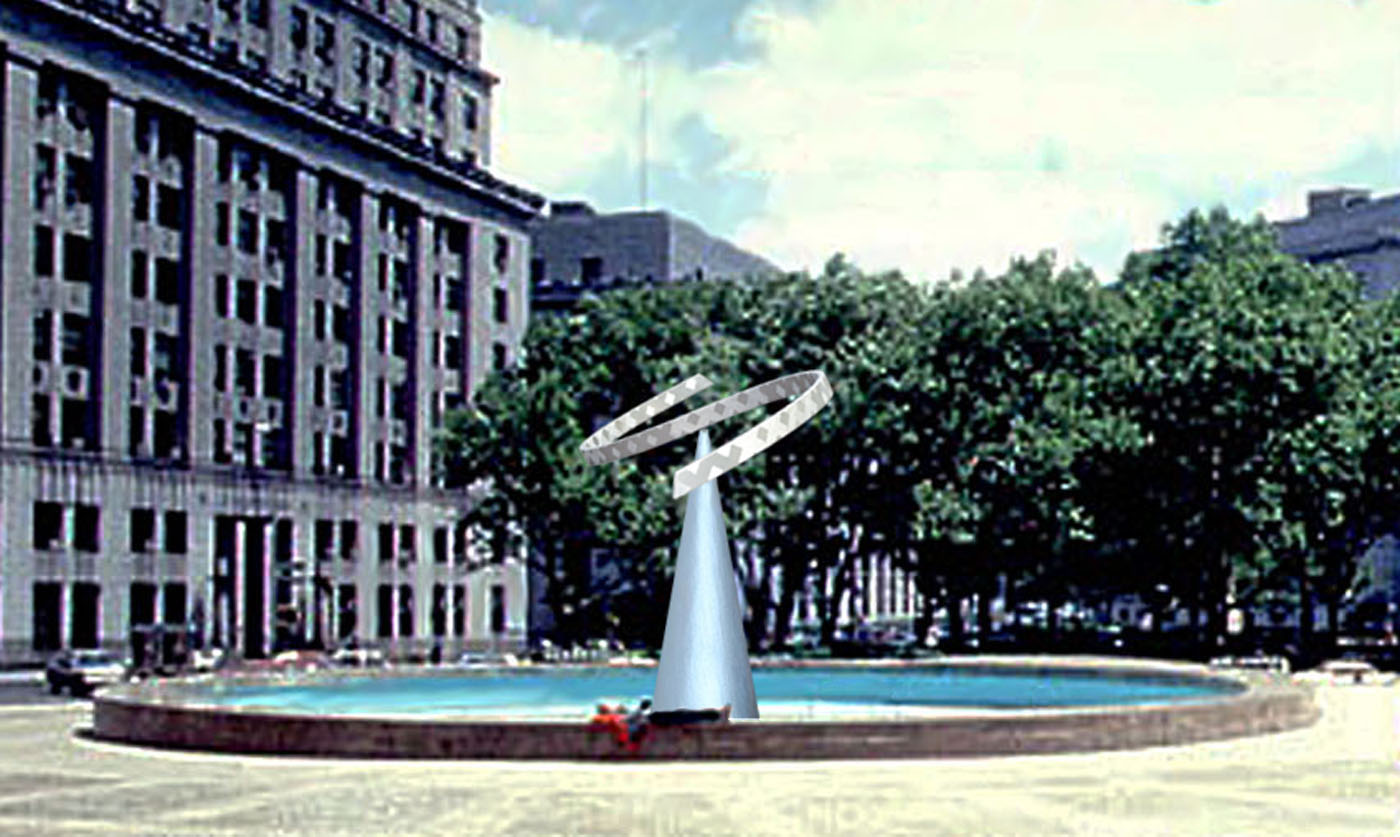 More realistically, the crowd-funded textured aluminum "Recurve" would be sited in the Foley Plaza fountain to discourage gawkers who might be crushed if the concealed electromagnet under the floor of the water-filled pool ever had its power cut off. I have not heard back from a famous physics professor, Brian Greene, to see if this is feasible, but future lunchtime viewers should be OK with it in any case, and it might save them from the Demons of Art Haters for rejecting "Tilted Arc!"