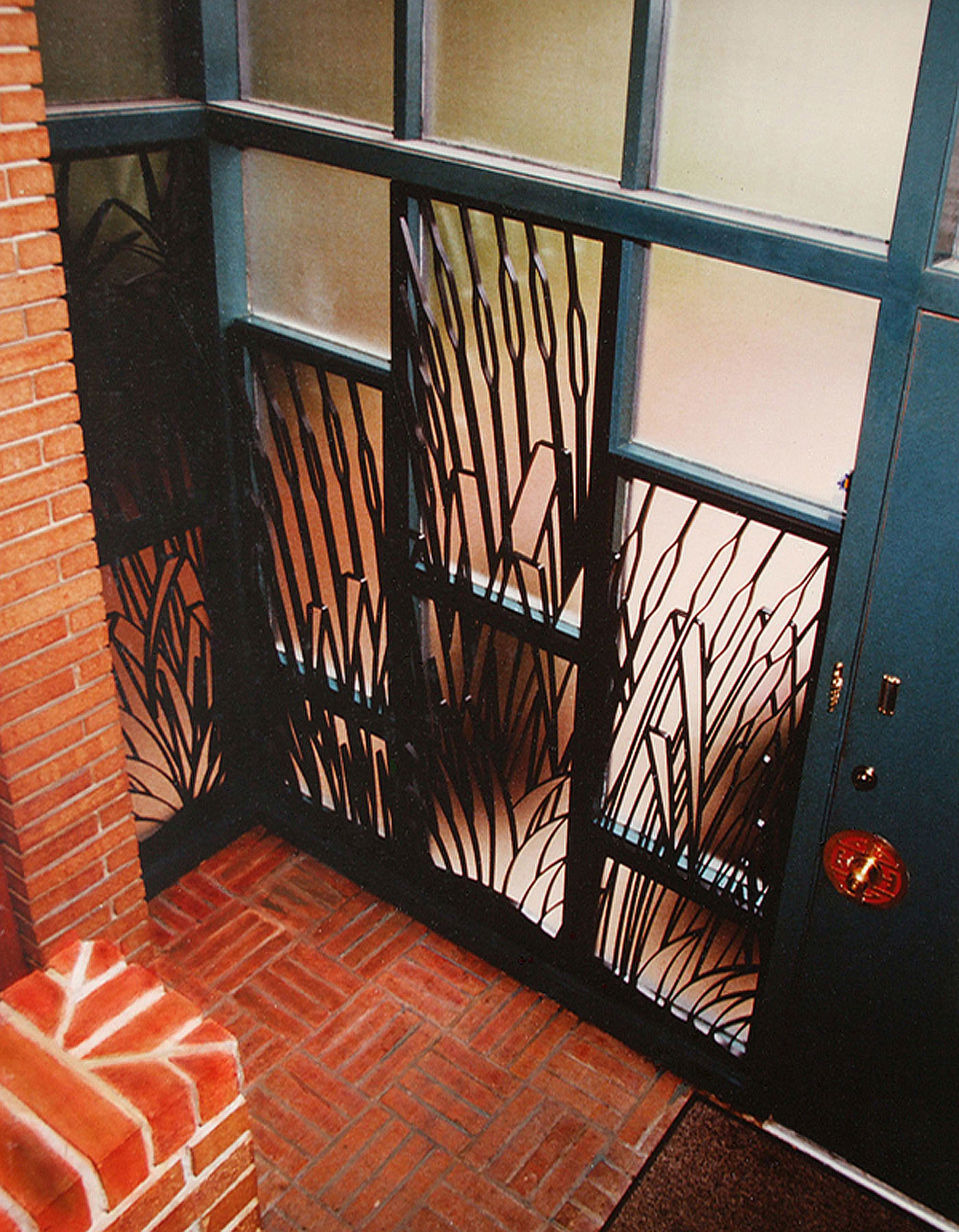 This is the 'to scale' line drawing of the "Cattails" security grill I designed for Mitten Gates, a wealthy Denver rubber heiress and my father's client. I copied it onto a transparency and with an overhead projector enlarged the image onto the floor of my Denver studio's main room, where I drew life-size artboard panels that guided the complex Tungsten Inert Gas (or TIG) aluminum welding process under heat-resistant tempered glass.