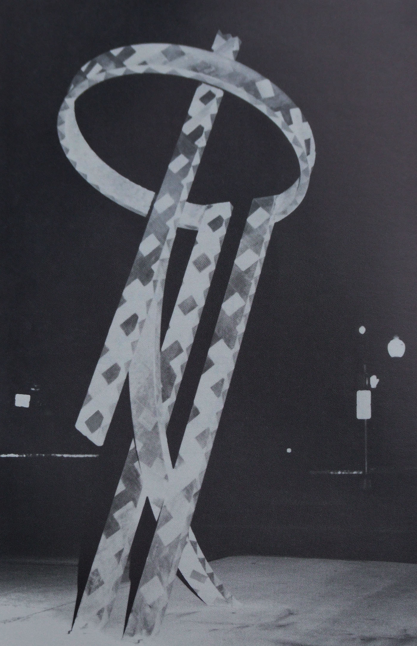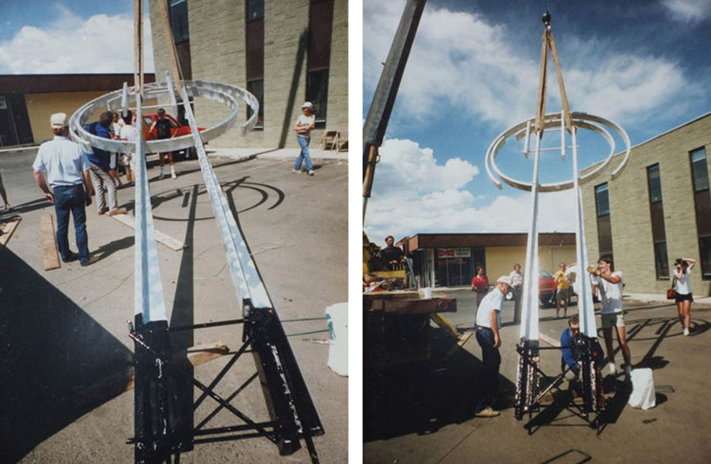 These two photographs show the raising of "Outlet," an original 18' tall textured aluminum sculpture fabricated from 2" by 6" thick-walled rectangular tubing, which was my first major effort at creating truly public outdoor sculpture. (I'm the dude inexplicably clad in a blue hoodie on the day of the Summer Solstice!)