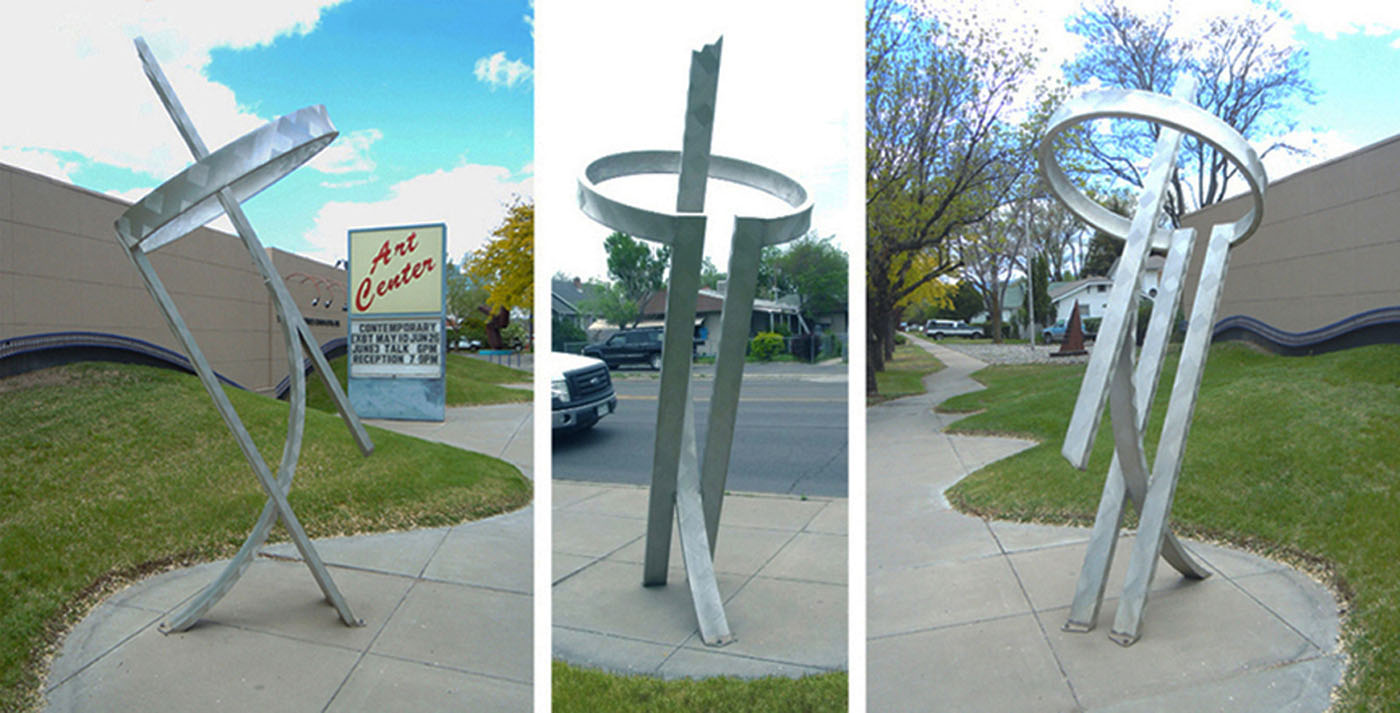 To continue: This website is incomplete, but will eventually contain more images of my latest work, including a relatively inexpensive ($160) piece of "Weaponized Sculpture," specifically, a light-weight vicious dog whacker, with an available quick-release nylon-web holster that can be worn and deployed while riding a bike. The 28"-long sword-like whacker has no sharp edges, but reflects light in an artistic manner, using my original technique for texturing aluminum. (Sadly, this embryonic idea died in the proverbial womb!) In the meantime, please check out my visual bio. Explanatory captions are under each image.