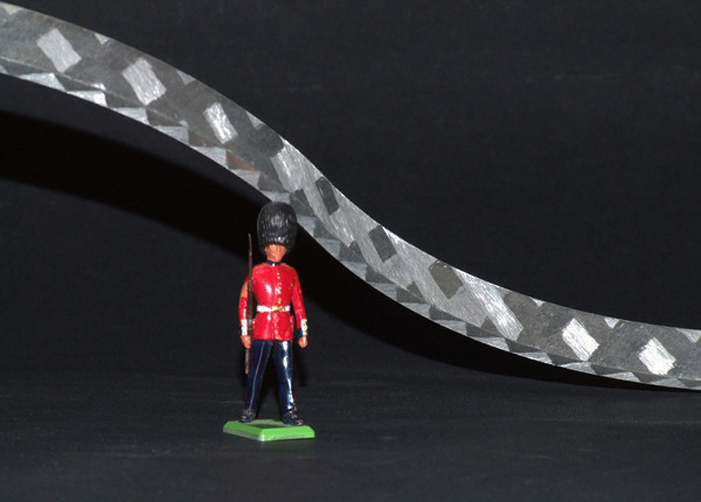 Going backward in time, this is my first piece of original sculpture - a leftover length of 1/4" by 3/4" aluminum flat bar from the "Cattails" security window - which I rolled into a S-shaped recurve and textured in a manner I found interesting. My texturing technique entails creating bands of three silvery diamond shapes (starting at the top left of the photo), followed by three dark gray diamonds on both 3/4" faces of the recurve, with alternating silvery and dark gray triangles on both 1/4" edges, to be repeated along the length of the sculpture. Interestingly, the deep grooves in the surface of the aluminum act as a kind of polarizing device, where a slight change in one's viewpoint reverses the coloration, with silvery areas becoming dark gray and dark gray areas changing to bright silver, a mysterious process that happens instantaneously.