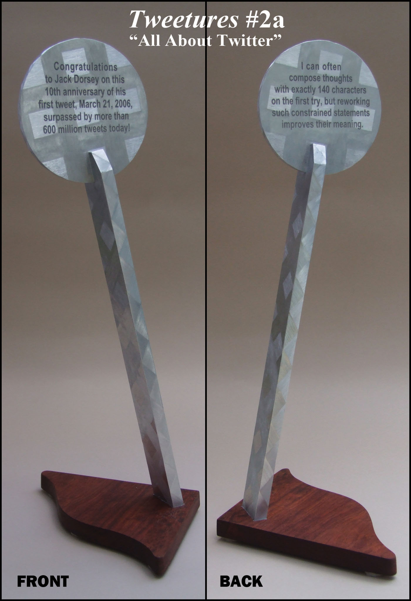 That same textured aluminum buckle design inspired a new line of simplified sculpture I call Tweetures (pronounced "twee-chers"), after my weird, long-standing obsession for always tweeting with exactly 140 characters - never less - even with Twitter's new 280 character limit! I gifted this second Tweetures design to Jack Dorsey, the CEO of Twitter, on the 10th anniversary of his first tweet, though I never heard back from him, which was unsurprising for a busy tech billionaire. It was titled "All About Twitter."