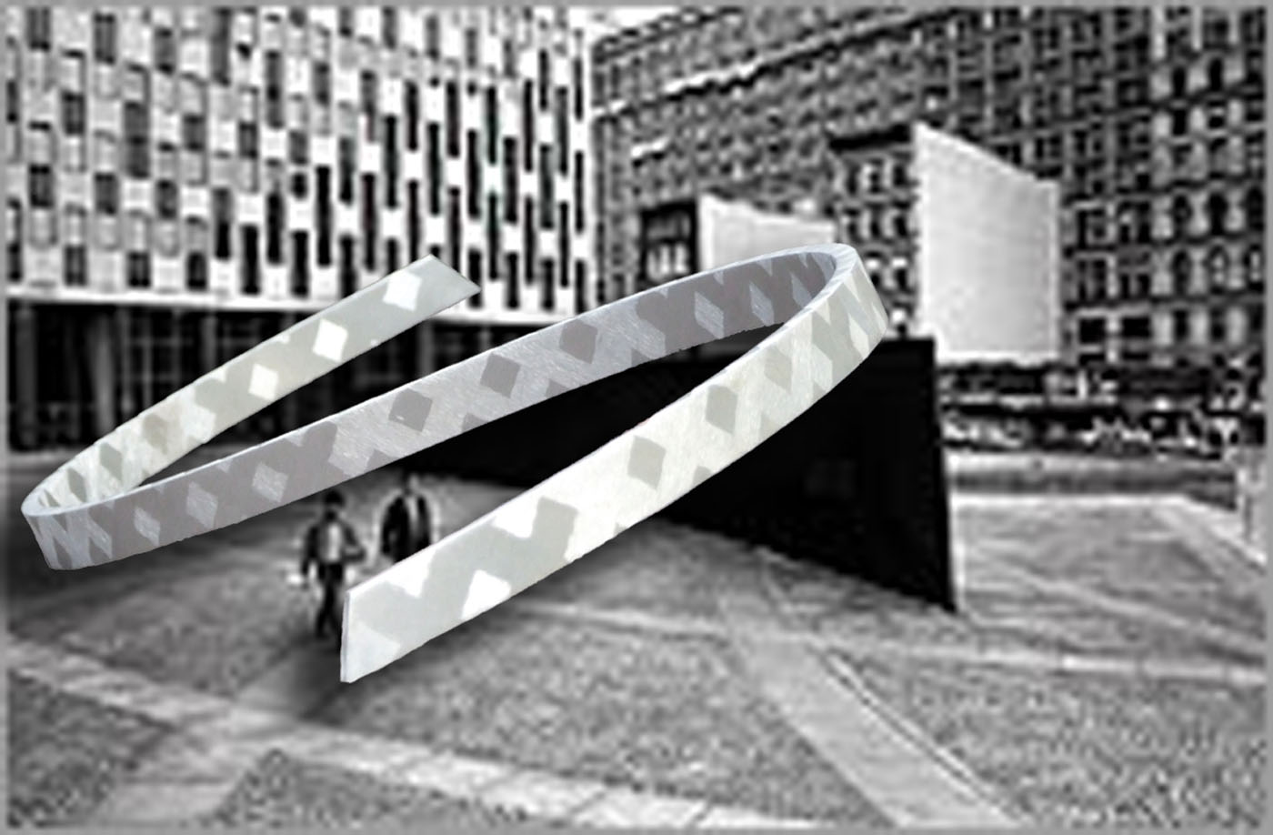 This is my humorous homage to Richard Serra's work. It represents a full embrace of his destroyed "Tilted Arc" masterpiece by my original artwork (titled "Recurve" of course), with the textured aluminum sculpture seeming to levitate above the now barren Foley Plaza floor.